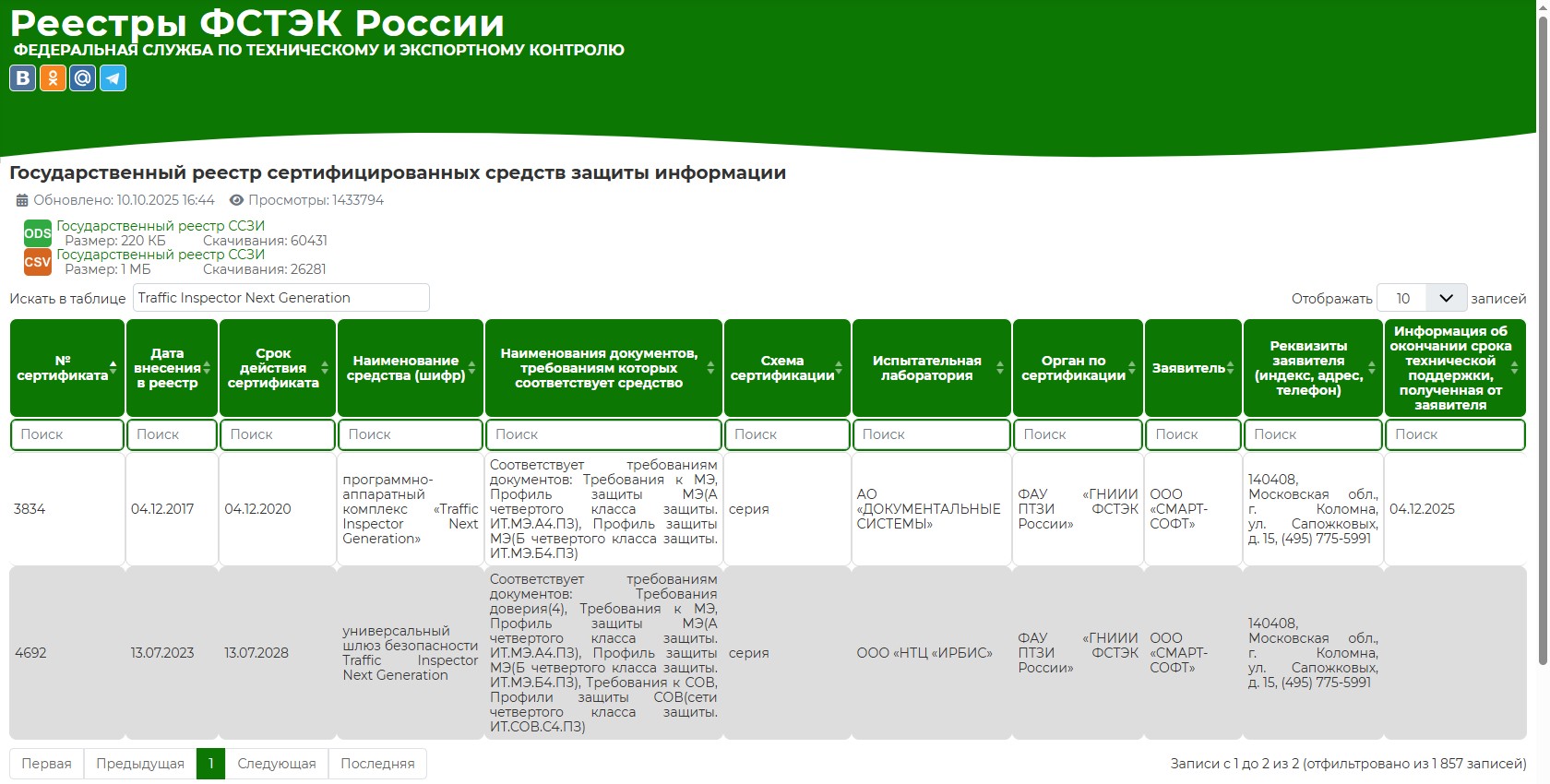 Информацию о сертификате на универсальный шлюз безопасности Traffic Inspector Next Generation можно найти на сайте ФСТЭК.
